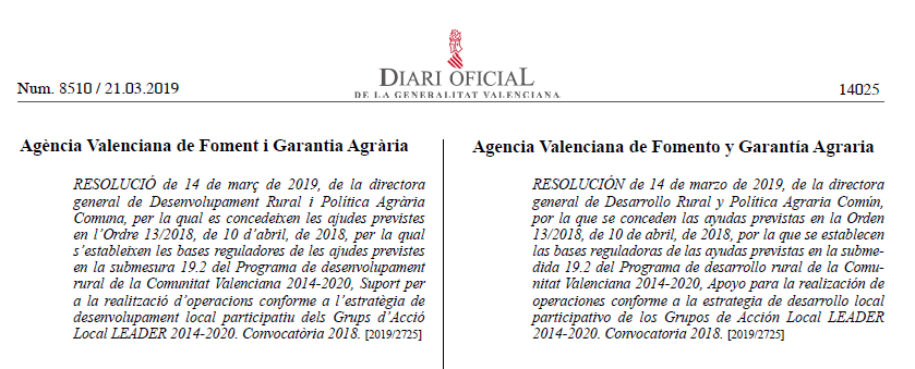 Hoy 5 de agosto se ha publicado en el DOGV, la concesión de la segunda convocatoria de ayudas Leader del ejercicio 2019. Se han concedido 207 proyectos en toda la Comunidad Valenciana de los cuales 115 proyectos se han aprobado a los 5 GAL de la provincia de Castellón liderando de nuevo, como en la primera convocatoria, el desarrollo de proyectos en los territorios rurales de la Comunidad Valenciana. Adjuntamos el enlace de la resolución publicada: http://www.dogv.gva.es/datos/2019/08/05/pdf/2019_7983.pdf