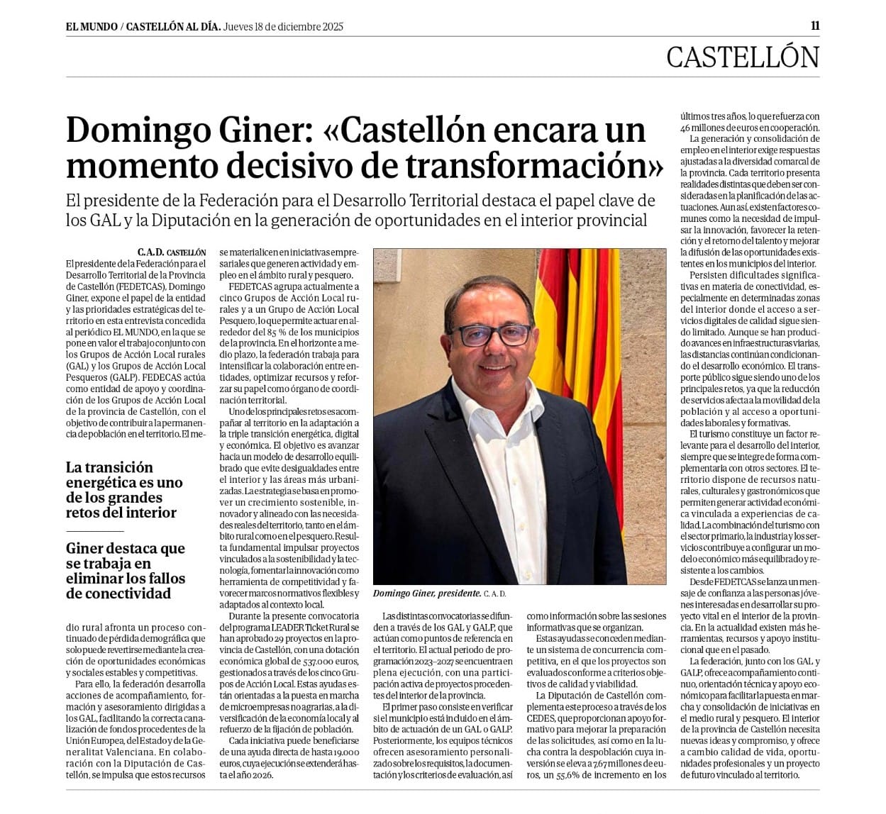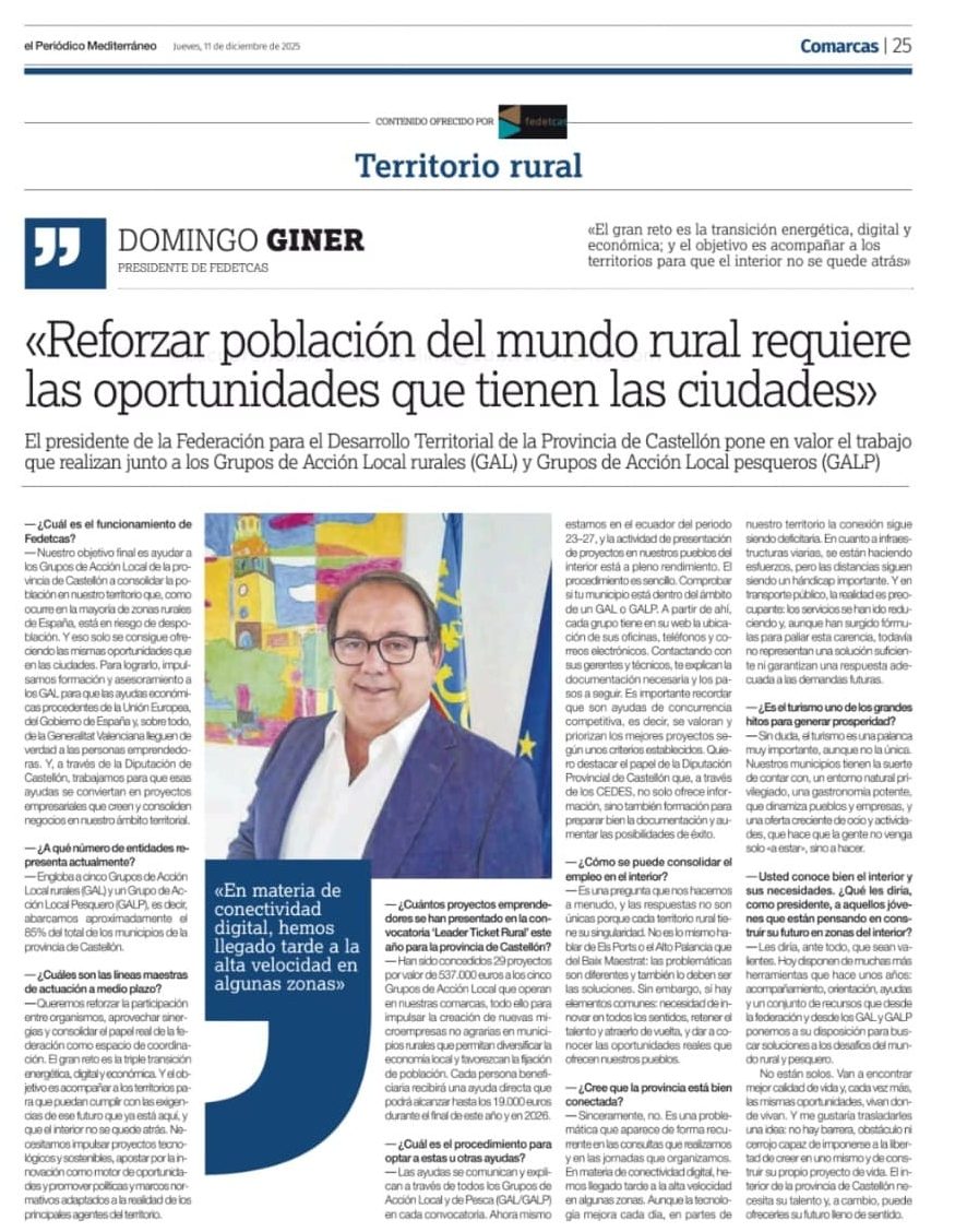 No te pierdas la entrevista que hoy jueves 11 de diciembre de 2025 el periódico Mediterráneo publica a nuestro presidente de fedetcas, Domingo Giner.